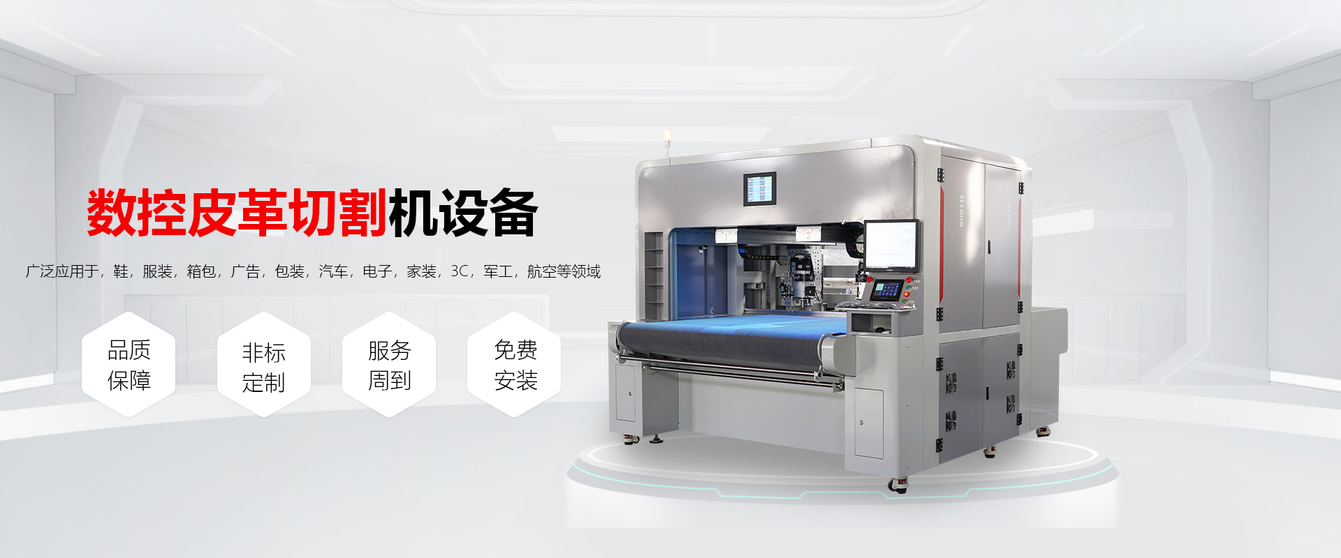 公司可根據(jù)客戶定制設備,廣泛應用于,鞋,服裝,箱包,廣告,包裝,汽車,電子,家裝,3C,軍工,航空等領域。